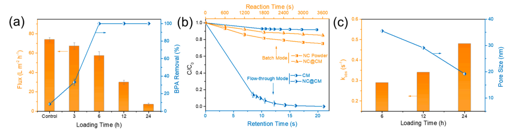 将NC@CM的PMS活化性能与原始CM(过滤式PMS活化模式)、NC粉末和块体NC@CM(一个批次的异源PMS激活模式)进行比较。BPA浓度随停留时间/反应时间的变化如图3b所示。在过滤-穿透模式下,纯基底CM对BPA的去除量远小于NC@CM,验证了NC涂层在PMS活化中的优异活性。值得注意的是,在处理相同体积的(200 mL)水样时,NC@CM的过滤式PMS活化模式比NC粉末和NC@CM的批量式PMS活化模式在更短的反应时间内具有明显更高的效率。