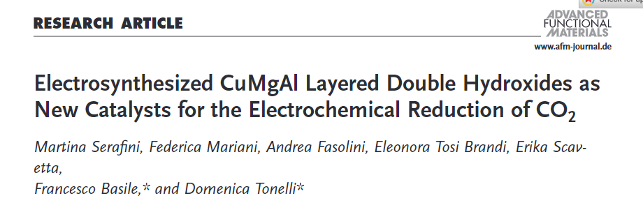 近日,意大利博洛尼亚大学Domenica Tonelli和Francesco Basile等人在碳质气体扩散膜上成功合成出一种新型的纳米结构CuMgAl层状双氢氧化物(LDH)基材料。该催化剂对CO2ER成CH3COOH具有很高的选择性催化活性。相关的研究成果以“Electrosynthesized CuMgAl Layered Double Hydroxides as New Catalysts for the Electrochemical Reduction of CO2”为题发表在Advanced Functional Materials上。