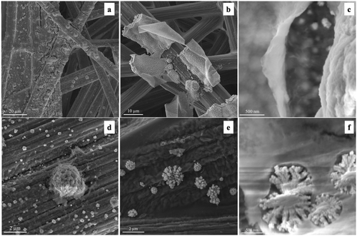 图2 a–c) 纤维上分层沉积物的SEM-FEG图像;具有花椰菜状d)和珊瑚状 e、f)形状的离散颗粒的SEM-FEG 图像。© 2023 Wiley