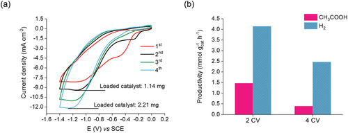 图6在-0.4 V vs RHE下产生CH3COOH a)和产生氢气 b)。© 2023 Wiley
