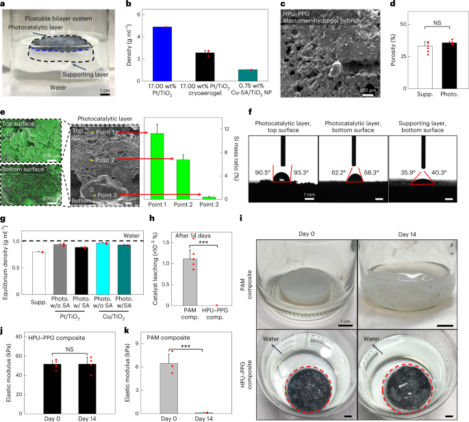 近日,首尔国立大学Taeghwan Hyeon和Dae-Hyeong Kim等人成功设计了一种多孔弹性体-水凝胶纳米复合材料构建的可漂浮光催化平台。该纳米复合材料可漂浮光催化平台被证实了其在太阳能制氢方面优于传统系统。相关的研究成果以“Floatable photocatalytic hydrogel nanocomposites for large-scale solar hydrogen production”为题发表在Nature Nanotechnology上。