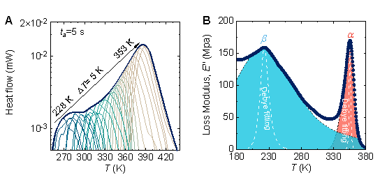 图3. PVC弛豫谱特征。(A) PVC在退火温度Ta=228-353 K下退火5 s的热流弛豫峰;(B) PVC的力学弛豫谱。