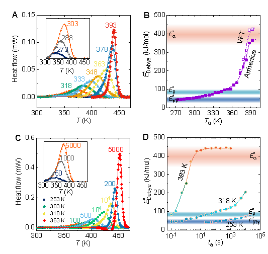 图4. Au49Cu26.9Ag5.5Pd2.3Si16.3弛豫谱的德拜方程分析。(A) Au基金属玻璃在退火温度Ta=273-393 K下退火5 s的热流弛豫峰(实点)与Debye模型拟合(实线);(B) A图中退火条件下的弛豫激活能;(C) Au基金属玻璃在退火温度Ta=253,303,318,363 K下退火不同时间的热流弛豫峰(实点)与Debye模型拟合(实线);(D) C图中退火条件下的弛豫激活能。