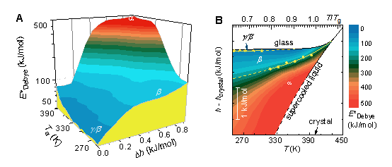 图6. 不同弛豫模式在焓空间中的演化规律。(A) 激活能随退火温度和弛豫焓变的关系;(B) 不同弛豫模式演化的温度-焓变相图。