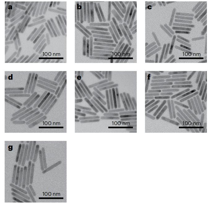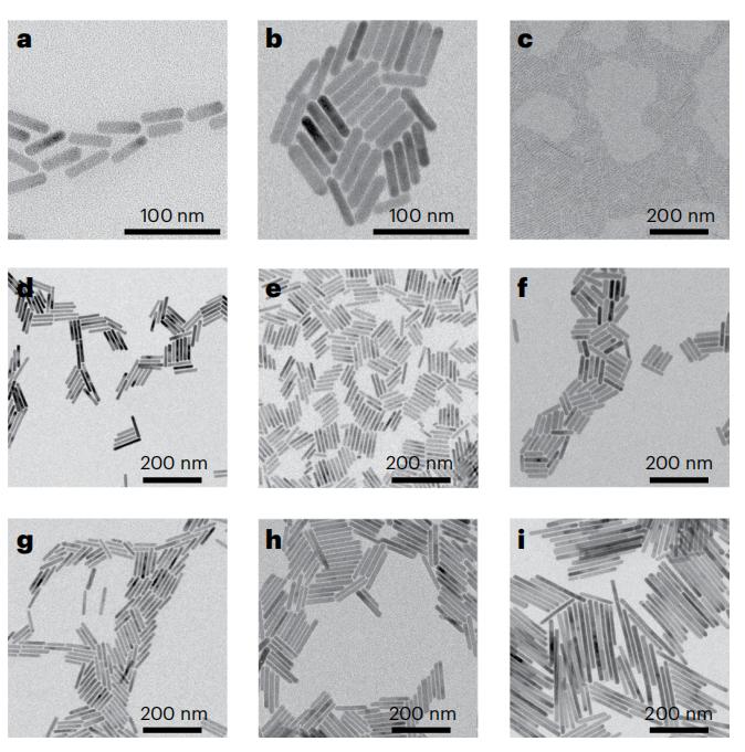 图2. 具有不同径向和轴向尺寸的PS包覆的钙钛矿纳米棒的TEM照片。©2023 Springer Nature