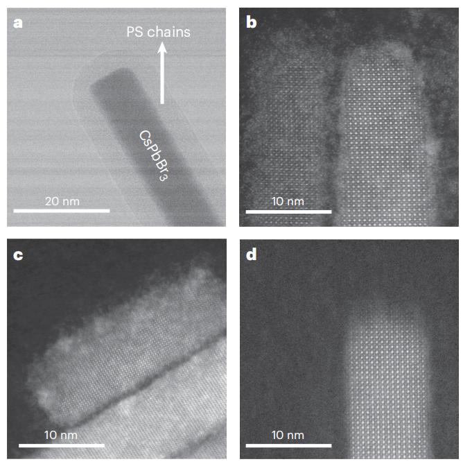 图4. PS包覆的钙钛矿纳米棒的TEM和HAADF-STEM照片。©2023 Springer Nature