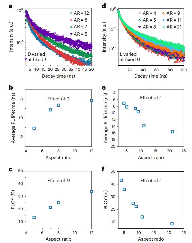 图5. 两类PS包覆的钙钛矿纳米棒的荧光寿命和发光量子产率随长径比的变化。©2023 Springer Nature