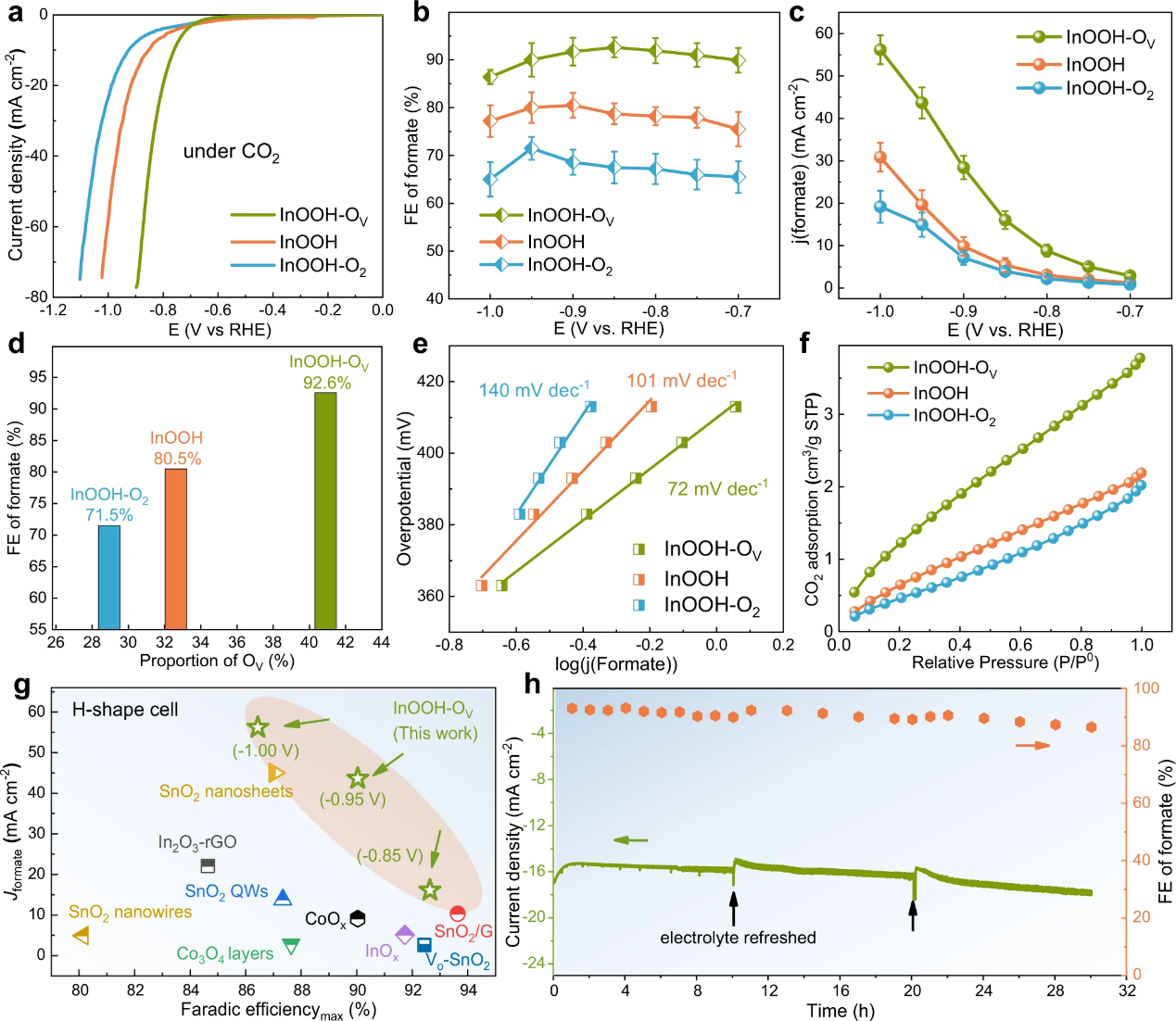 图3 电化学CO2RR性能。(a) InOOH, InOOH-O2和InOOH-OV在CO2气氛中的LSV曲线。三组样品的(b)甲酸盐法拉第效率和(c)甲酸盐电流密度。(d)甲酸盐最大法拉第效率和氧空位比例之间的关系。InOOH, InOOH-O2和InOOH-OV的(e) Tafel曲线和(f) CO2吸附测试。(g) InOOH-OV与此前报道的其它催化剂在H型电解池中的CO2还原制甲酸盐性能对比。(i) InOOH-OV在−0.85 V电位下运行30 h的稳定性测试。©2023 Springer Nature