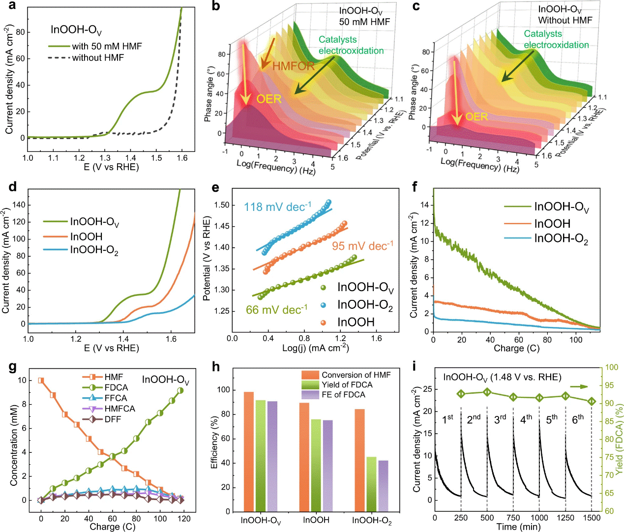 图4 电化学HMFOR性能。(a) InOOH-OV在含有和不含HMF电解液中的LSV曲线。(b-c) InOOH-OV在含有和不含HMF电解液中的Bode相图。(d)在含有10 mM HMF的1 M KOH溶液中,InOOH-OV, InOOH和InOOH-O2于5 mV s−1扫描速率下的LSV曲线。(e)相应的Tafel曲线。(f)三组样品的电流密度随电解电荷的变化。(g)在InOOH-OV催化剂作用下,反应物和产物浓度随电解电荷的变化。(h)三组样品的HMF转化率、FDCA产率和法拉第效率对比。(i) InOOH-OV的HMFOR稳定性测试。©2023 Springer Nature