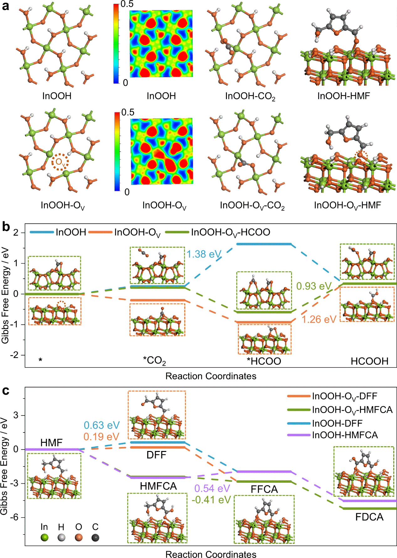 图5 (a) InOOH和InOOH-OV的构筑模型示意图和相应的电子局域函数(ELF),以及CO2和HMF的吸附构型。(b) InOOH, InOOH-OV和InOOH-OV-HCOO的CO2RR自由能。(c) InOOH和InOOH-OV的HMFOR自由能。其中绿色为In,灰色为C,红色为O,白色为H。©2023 Springer Nature