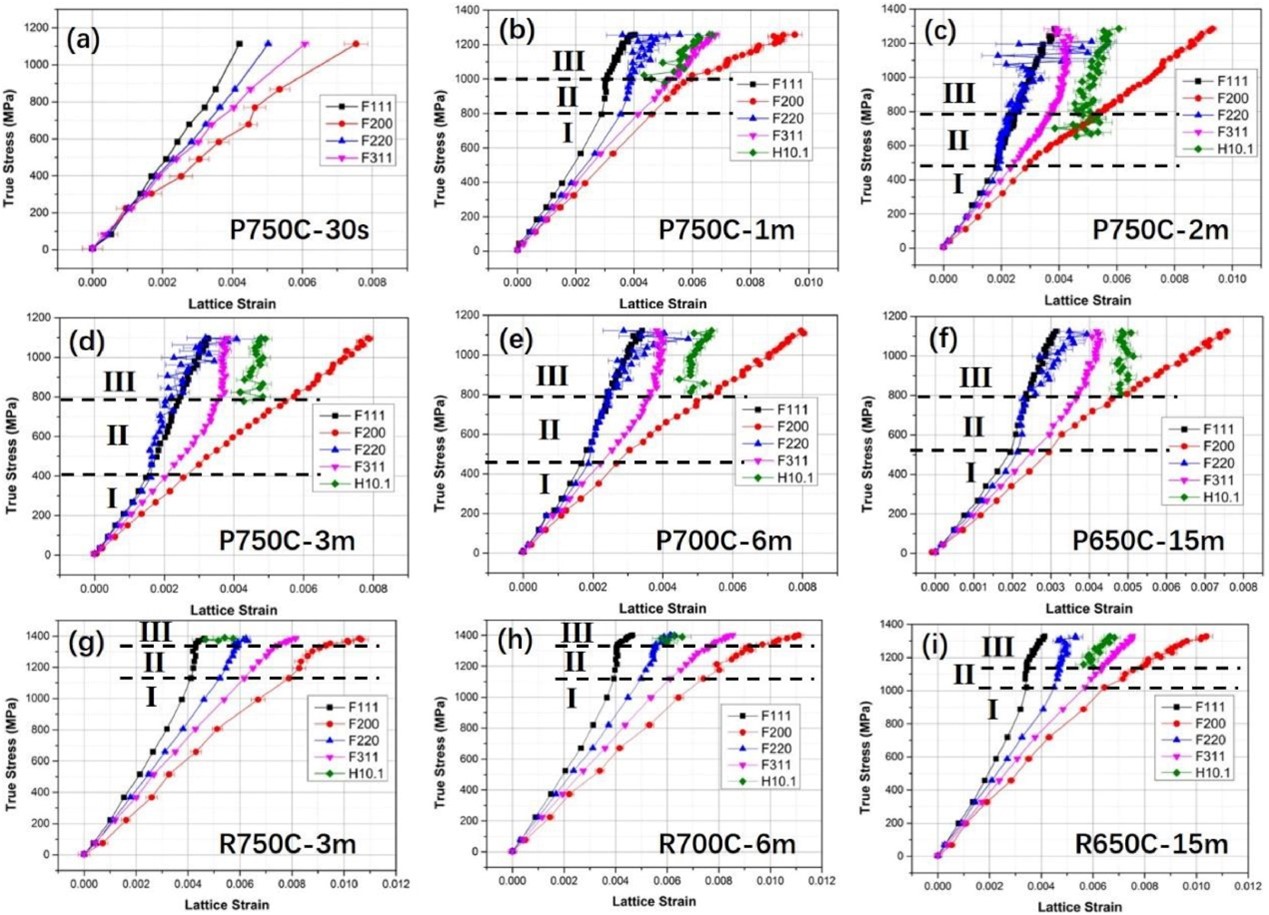 图2 不同样品沿载荷方向的宏观真实应力下面心立方体(FCC)和六方封闭堆积(HCP)晶粒族的晶格应变演变:(a) P750C-30s,(b) P750C-1m,(c) P750C-2m,(d) P750C-3m,(e) P700C-6m,(f) P650C-15m,(g) R750C-3m,(h) R700C-6m,(i) R650C-15m。