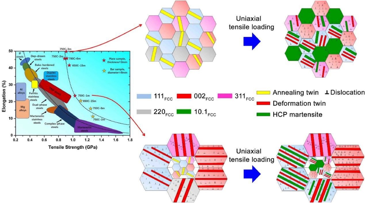 图5. 研究的间隙型亚稳态高熵合金的拉伸性能(拉伸强度与延伸率)与传统金属材料的比较,以及不同拉伸性能合金中变形机制的相应示意图。