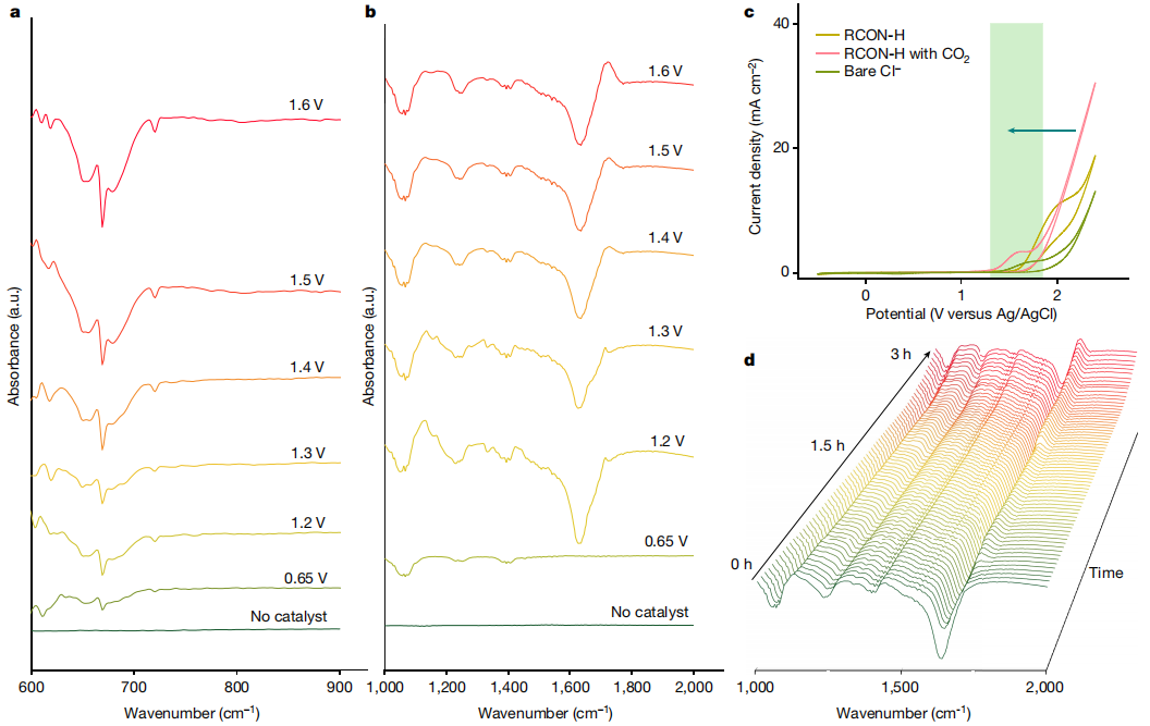 图3探究CER机制。a、b、NCOOH的原位ATR-SEIRAS。c、1a在均相电化学测试中的循环伏安曲线。绿色阴影区域指的是氧化还原峰区域,箭头表明自由基形成的氧化还原电位随着CO2的减少而降低。d、在CO2存在下的1.6 V CER 3小时过程中,1a的原位时间分辨ATR-SEIRAS,以监测中间体的形成。原位ATR-SEIRAS分析在5 M NaCl(pH=2)中进行。在c中,1a溶解在10 ml 甲醇中(加入0.1 mol/l LiClO4和1 ml H2O),以达到40 mmol/l的浓度,并加入10 mM 四丁基铵盐。在充满气体15分钟以上(200 sccm)后进行CO2测试,然后以100 mV/s的扫描速率快速进行循环伏安测试。© 2023 Springer Nature