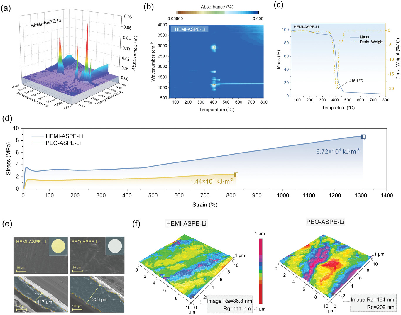 为了解决全固态聚合物电解质的机械强度和离子电导率相悖性的问题,提出了一种高熵微区互锁的全固态聚合物电解质的设计思路。受高分子和生物化学科学中熵弹性的启发,首次将ABC杂臂星型三元聚合物引入聚环氧乙烷中,提出了高熵微区互锁ASPEs(HEMI-ASPEs)概念。HEMI-ASPE具有多功能聚合物链,可诱导自身组装成具有高拓扑结构熵的微米级和纳米级动态互锁网络。HEMI-ASPE具有出色的韧性。锂对称电池可以稳定循环超过4000 h,以磷酸铁锂为正极、金属锂为负极组装的全电池循环300次容量保持率可达到96%以上。这项工作提出了一种创新的设计理念,为ASPE引入了高熵超分子动态网络提供思路。