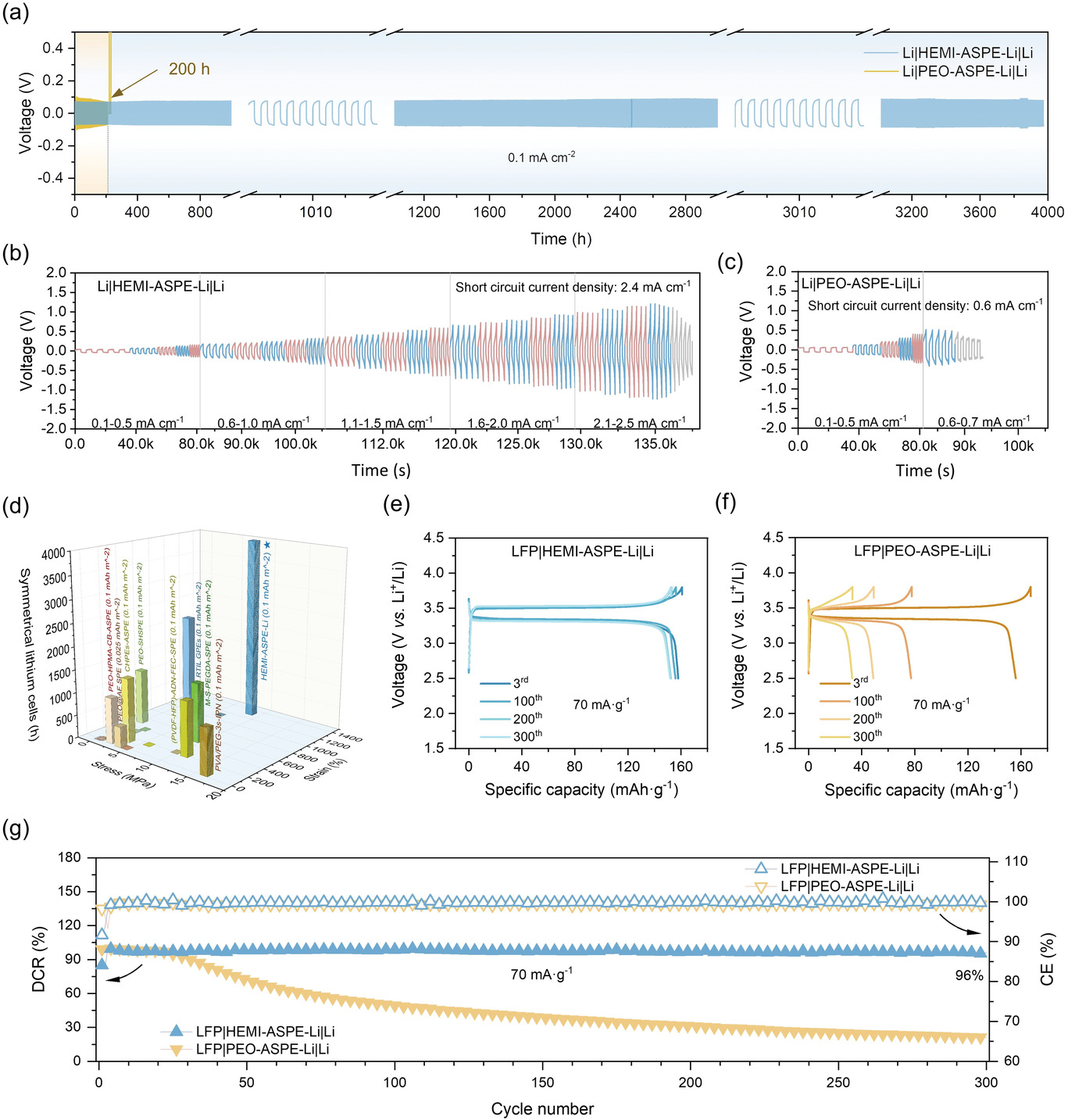 通过ATRP、ROP与“点击”化学活性聚集反应策略,结合物理设计和具有特定末端功能基团的ABCTP,使HEMI-ASPE-Li薄膜具有较高的离子导率,较好的阳离子迁移数和热稳定性。这些改进很大程度上归功于超分子自组引导的高浓度微纳尺寸动态互联网络的形式。HEMI-ASPE-Li | Li对称电池在4000小时内表现出稳定的Li沉积/剥离性能,LiFePO4|HEMI-ASPE-Li|Li在300个循环后表现出高容量保持率(≈96%)。另外,在AS-SMB中也验证了类似的改进,表现HEMI-ASPE的普遍适用性。