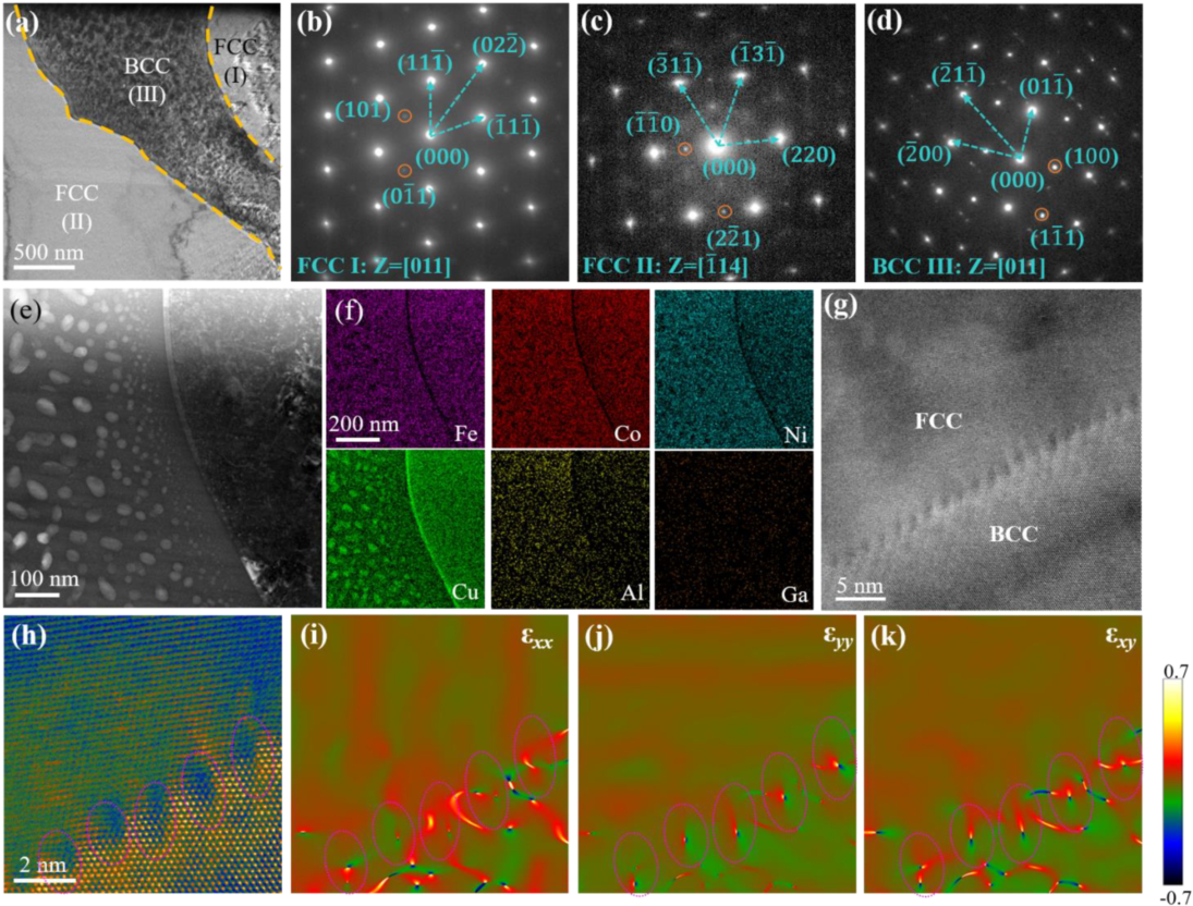 图1 (a) HEA2合金中不同相BF TEM,(b-d)分别为图(a)中FCC(I)、FCC(II)和BCC(III)区的SAED,FCC/BCC界面处(e-f) STEM-HAADF和EDS图谱,(g) HAADF-STEM,(h)温度模式图,GPA图:(i)水平应变,(j)垂直应变和(k)剪切应变