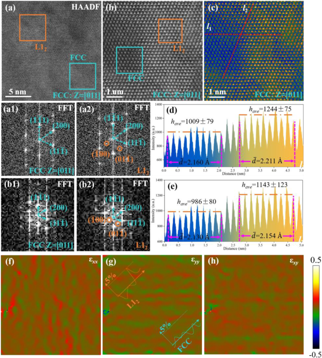 图2 FCC相中共格结构,(a,a1,a2)FCC相的HAADF-STEM图和不同区域的FFT图,(b,b1,b2)原子分辨率的HADDF-STEM图和不同区域的FFT图,(c) HADDF-STEM温度模式图,(d,e)图(c)中红线标记处强度分布,(f-h)水平、垂直和剪切方向GPA图,图(g)中的插图显示了图(a)中橙色和青色框相应位置的应变程度