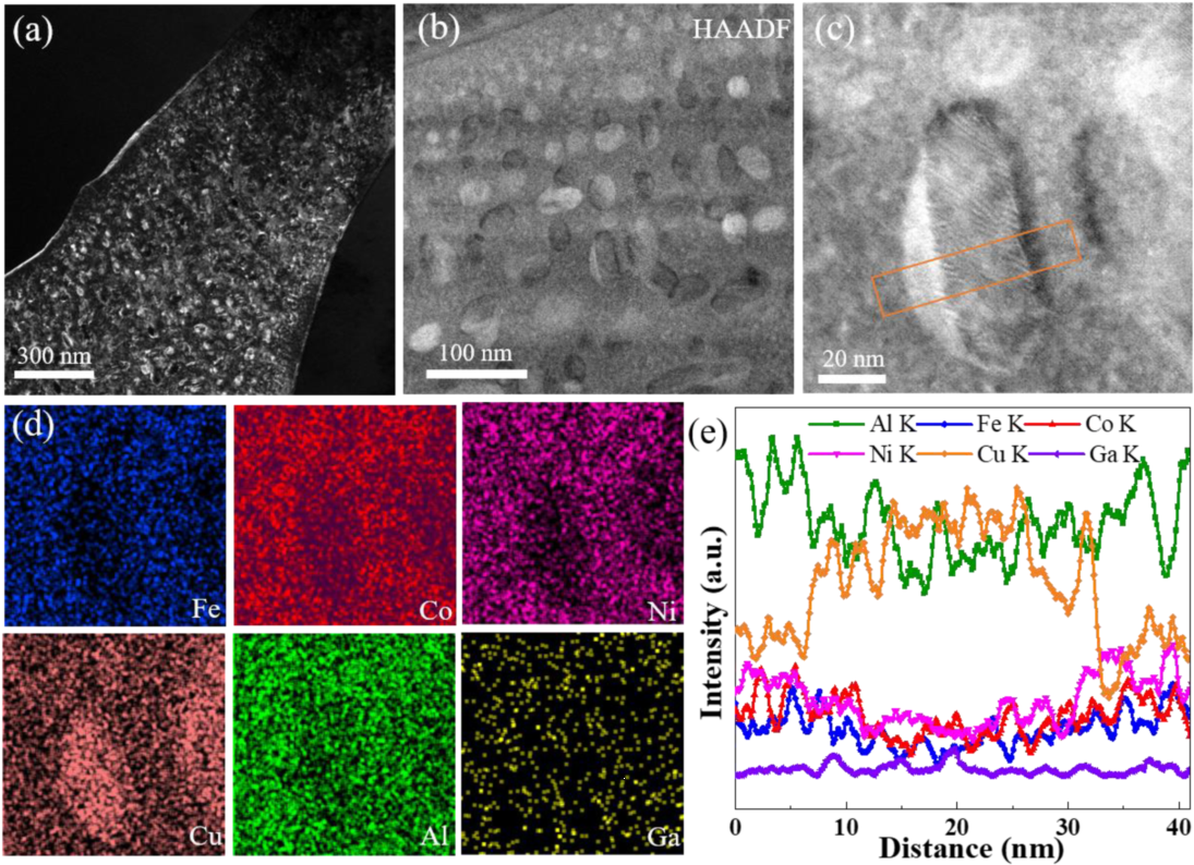 图3 (a)HEA2合金中BCC相的DF图,(b) HADDF图,(d-e)纳米析出相的ADF图、元素面扫和线扫描图。