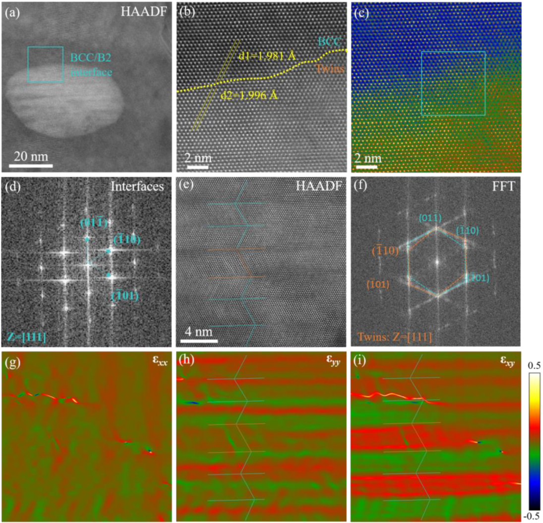 图4 (a)BCC相中B2纳米析出相的HAADF-STEM图,(b) BCC/B2界面的高分辨率图像和(c)温度模式图,(d)青色框中BCC/B2界面处FFT图,(e,f)孪晶相纳米析出相的高分辨率图和FFT图,(g-i)水平、垂直和剪切方向应变分布图