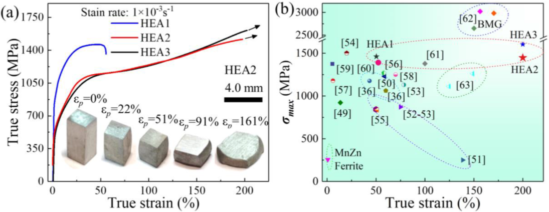 图5 FeCoNiCuAlGa HEAs的力学性能,(a)真实应力-应变曲线,插图显示了HEA2合金不同应变强度下照片,(b)HEA1-HEA3合金的性能对比图