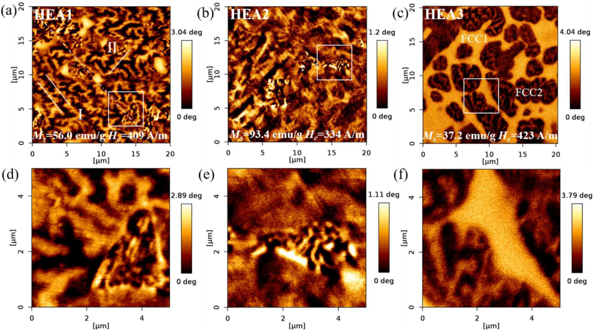 图6 FeCoNiCuAlGa HEAs不同放大倍数下的MFM图,(a,d)HEA1,(b,e)HEA2,(c,f)HEA3