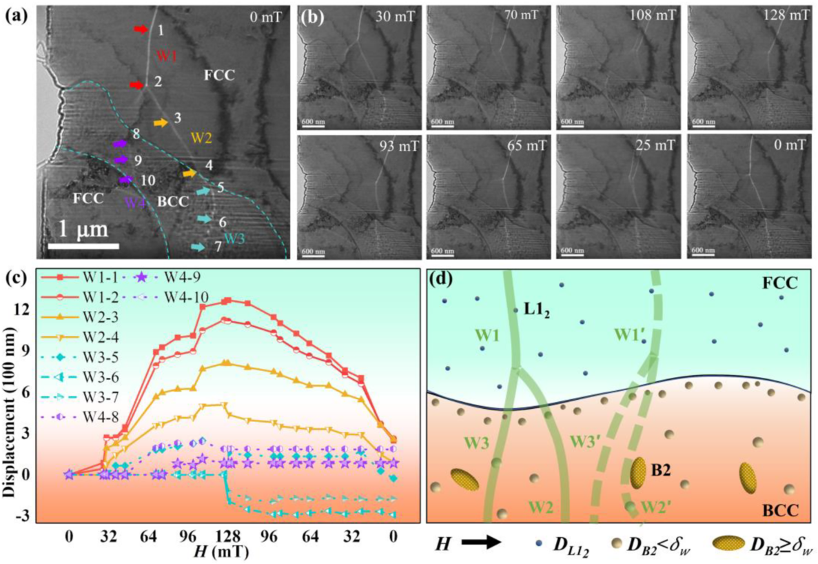 图7 (a)过焦模式下HEA2洛伦兹TEM图,(b) 不同水平磁场下(0-128 mT)原位洛伦兹TEM,(c)图(a)中的点1-10在外场下的位移,(d)析出相对磁畴壁的钉扎效应示意图