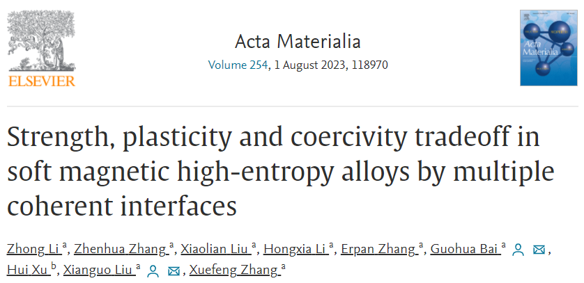 相关成果以“Strength, plasticity and coercivity tradeoff in soft magnetic high-entropy alloys by multiple coherent interfaces”为题发表在国际金属顶刊《Acta Materialia》上。杭州电子HTH官网地址 大学为第一通讯单位,杭州电子HTH官网地址 大学李忠为第一作者,通讯作者为杭州电子HTH官网地址 大学白国华教授和刘先国教授。该成果获国家杰出青年科学基金、国家自然科学基金、浙江省重点研发计划和浙江省自然科学基金项目的支持。