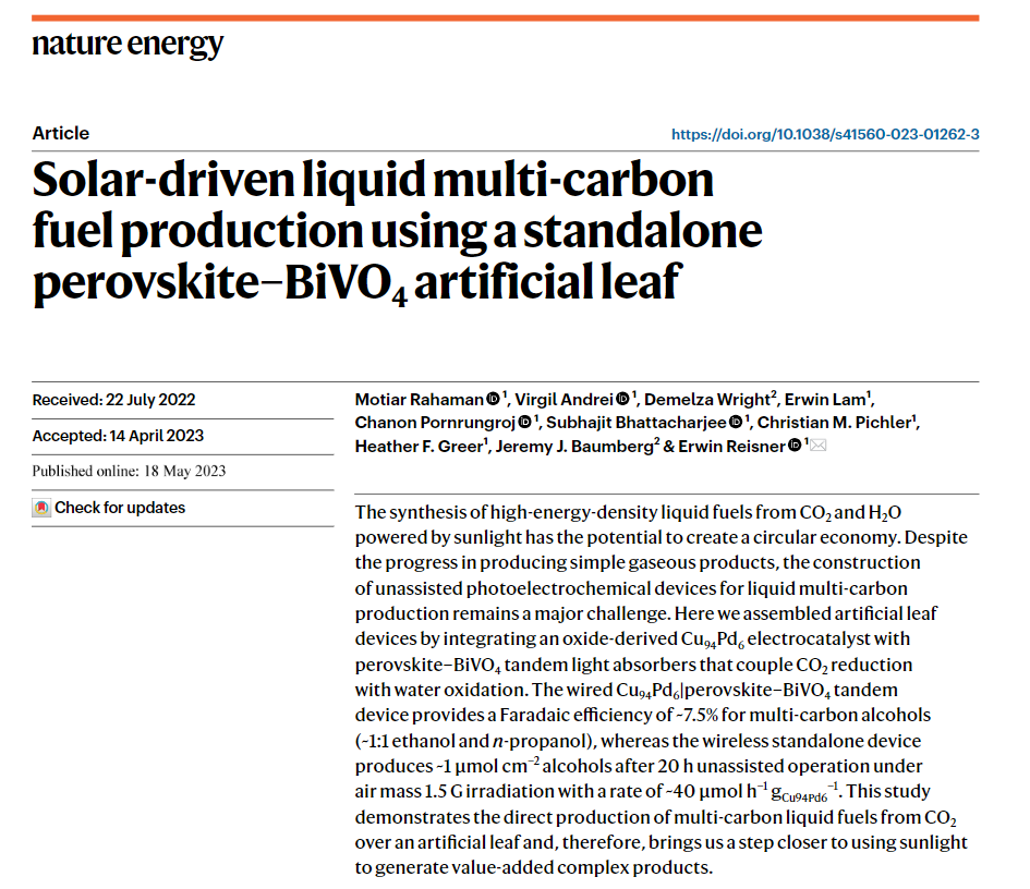 近日,剑桥大学Erwin Reisner教授等人将氧化物衍生的Cu94Pd6电催化剂与钙钛矿-BiVO4串联光吸收剂相结合来组装成人造树叶,该人造树叶装置可实现高效多碳醇生产。相关的研究成果以“Solar-driven liquid multi-carbon fuel production using a standalone perovskite–BiVO4 artificial leaf ”为题发表在Nature Energy上。