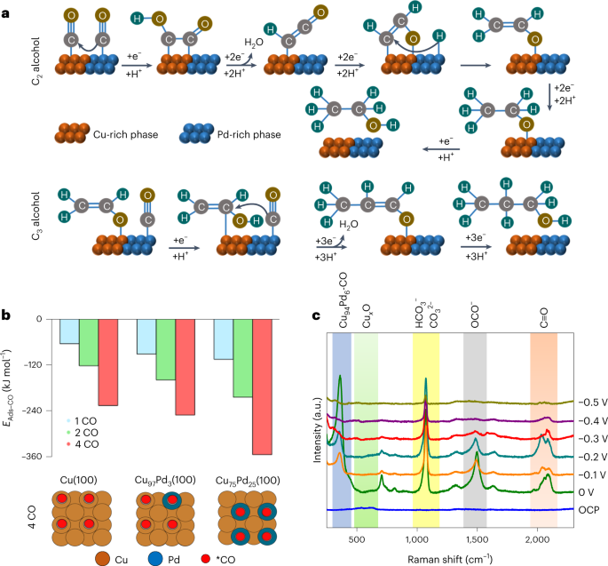 图3 在低过电势下活化的Cu94Pd6催化剂上多碳生产的机理分析。©2023 Springer Nature