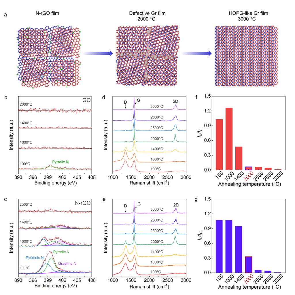 图一 氧化石墨烯和氮掺杂石墨烯膜在热处理过程中氮原子的化学状态和石墨烯缺陷结构的演变过程。(a) N-rGO膜在热处理过程中向类HOPG石墨烯膜结构演变示意图。(b-c) GO和N-rGO膜在不同热处理温度下的XPS N1s谱。(d-g)GO和N-rGO膜在不同热处理温度下的拉曼光谱及其对应的ID/IG。