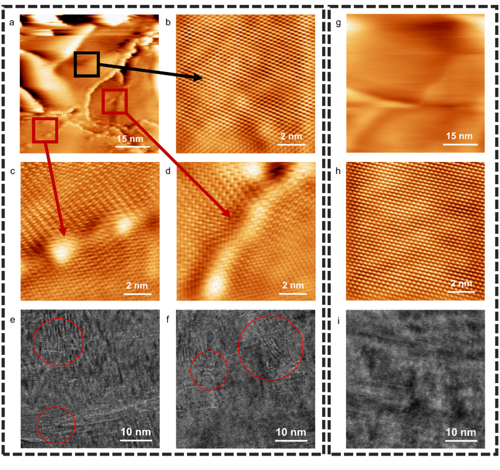 图二 2000°C热处理后氮掺杂石墨烯和氧化石墨烯膜的表面和截面微观结构特点。(a-f)2000°C时N-rGO膜的扫描隧道显微镜(STM)表面结构表征(a-d)和透射电子显微镜(HRTEM)截面结构表征(e-f),表明N-rGO-2000膜中丰富的位错、晶界等缺陷结构。(g-i)2000°C时GO膜的STM和HRTEM结构表征,表明GO-2000膜中较为完整定向的结构。