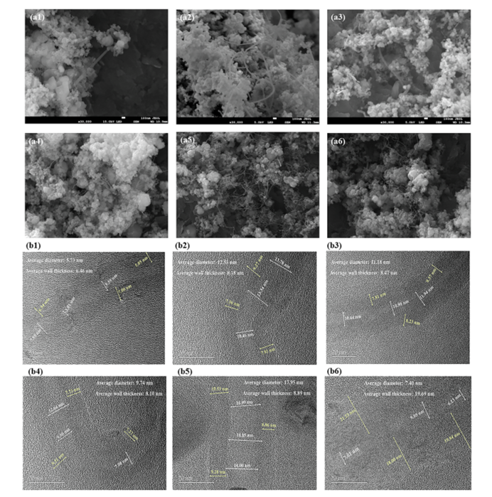 图11 (a1) SiC的SEM图像,(a2)铁/碳化硅,(a3)镍/碳化硅,(a4) Fe-Ni/SiC (1:1),(a5) Fe-Ni/SiC (2:1),(a6) Fe-Ni/SiC (1:2),有(b1) SiC的图像,(b2)铁/碳化硅,(b3)镍/碳化硅,(b4) Fe-Ni/SiC (1:1),(b5) Fe-Ni/SiC (2:1),(b6) Fe-Ni/SiC(1:2);© 2023 Elsevier Ltd. All rights reserved.