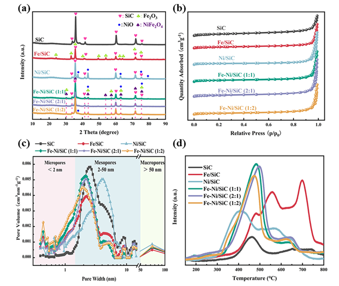 图4 (a) XRD谱图,(b,c) N2吸附–脱附等温线,(c)孔径分布,(d) SiC及改性SiC催化剂的H2-TPR;© 2023 Elsevier Ltd. All rights reserved.