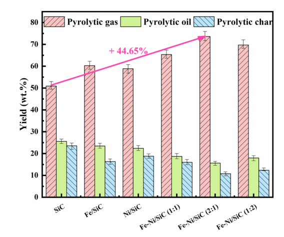 1、该研究成功构建了一系列具有微波吸收和催化能力的双功能催化剂(Fe-Ni/SiC),实现了废塑料微波催化热解的高价值应用。