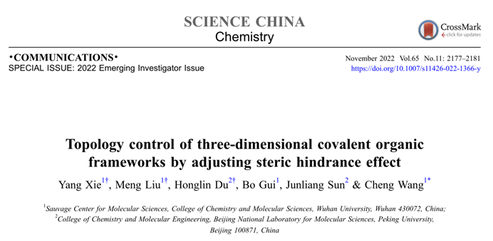 相关研究成果以“Topology control of three-dimensional covalent organic frameworks by adjusting steric hindrance effect”为题发表在国际著名期刊SCIENCE CHINA Chemistry上。