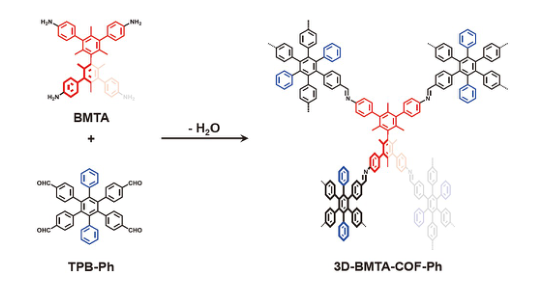 1、该研究通过1,2,4,5-四(4-甲酰基苯基)-3,6-二苯基苯(TPB-Ph)与3,3′,5,5′-四(对氨基苯基)-双均三甲苯(BMTA)的缩聚,成功设计并合成了一种新型的3D COFs(3D BMTA-COF-Ph)。