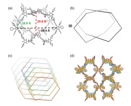 图5 3D BMTA-COF-Ph的结构表征;单点网络(a, b),五重互穿点拓扑(c)和沿b轴的一维通道(d);© Science China Press and Springer-Verlag GmbH Germany, part of Springer Nature 2022.