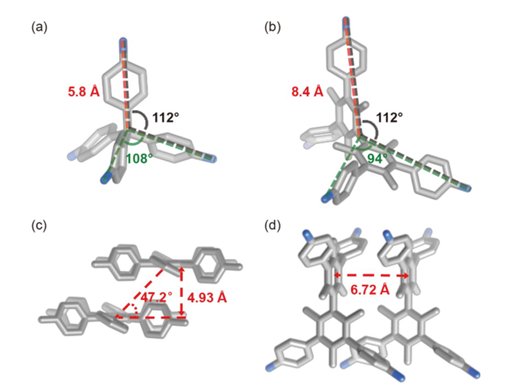 图6 TAPM (a)与BMTA (b)的几何尺寸比较;3D BMTA-COF-Ph中TPB-Ph (c)和BMTA (d)的分子排列;© Science China Press and Springer-Verlag GmbH Germany, part of Springer Nature 2022.