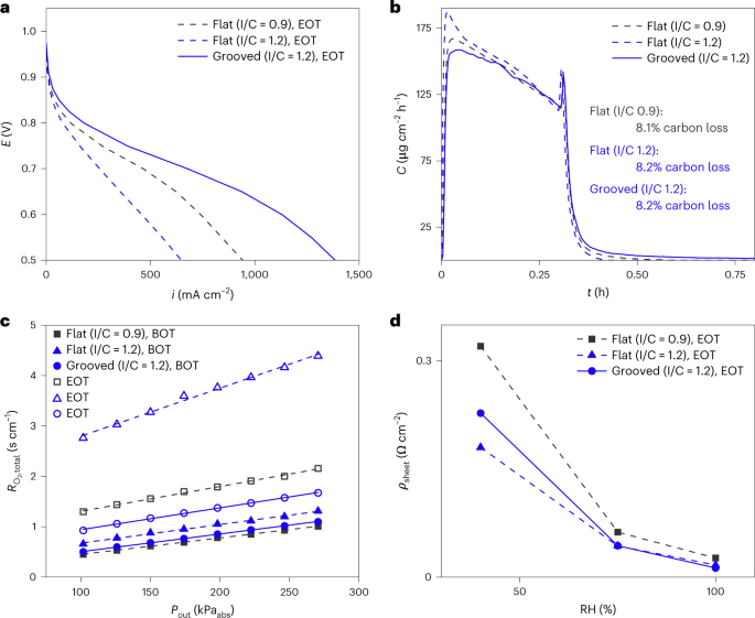 图2 具有平面和凹槽电极的燃料电池的性能。©2023 Springer Nature