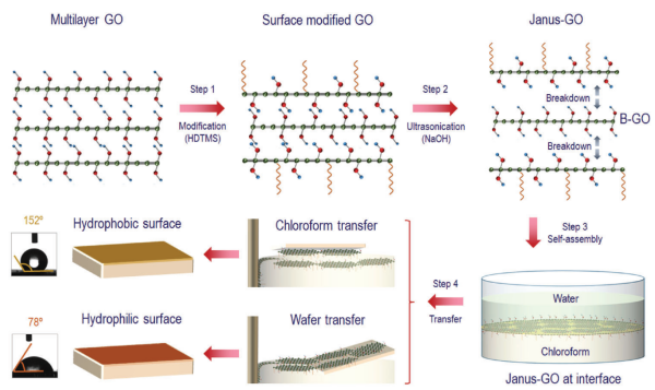 通过对GO的不对称(亲水/疏水性)修饰,使得其可以在油/水界面处自组装成大面积、连续的高质量2D材料薄膜,同时可以将其转移至任意目标基底上。该方法具有一定的普适性,为2D材料基光电器件的规模化应用提供了新方法。