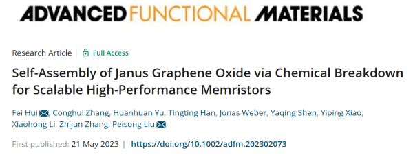 本工作通过一种简易的方法(“化学破碎”+油/水两相界面自组装)来获得大面积高质量的双面神结构氧化石墨烯(J-GO)薄膜,再将其作为中间层构筑了垂直结构(Ag/J-GO/Au)的忆阻器,并研究了其电学阻变特性和作为人工突触的可塑性等行为。结果显示:Ag/J-GO/Au忆阻器展现出优异的阈值型阻变开关行为,例如低泄漏电流(≈10-12 A),低工作电压(≈0.3 V),高耐久性(>12,000 次),以及成功模拟了生物突触的部分典型可塑性行为。这项工作提供了一种获得大面积、连续和均匀Janus 2D薄膜的新策略,并验证了Janus 2D材料在固态微电子领域(电学仿生突触)中的新应用。相关成果以“Self-Assembly of Janus Graphene Oxide via Chemical Breakdown for Scalable High-Performance Memristors”为题发表在国际权威期刊Adv. Funct. Mater., 2023, DOI: 10.1002/adfm.202302073.