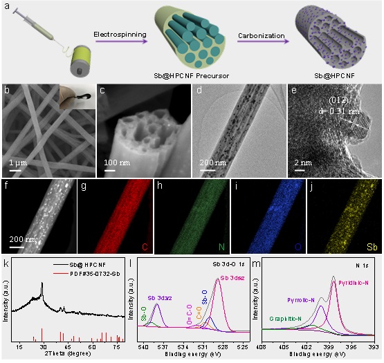 图1 Sb@HPCNF的a)合成示意图, b, c)SEM及c, d)TEM照片, f-j)元素Mapping及k)XRD图谱;i)Sb 3d-O 1s及m)N 1s的XPS精细谱