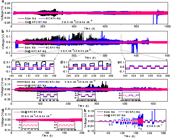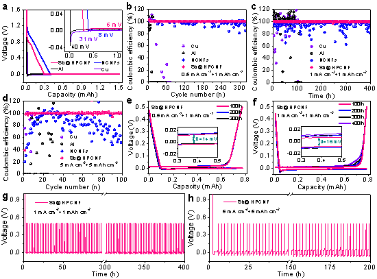 图2 半电池的电化学性能。金属Na在不同集流体表面的a)形核过电位曲线,b-d)库伦效率曲线及e-f)不同循环圈数下的电压-容量曲线;g-h)Sb@HPCNF基底上进行Na沉积/剥离的电压-时间曲线