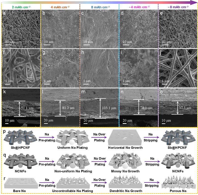 图4 在0.5 mA cm−2下,金属Na在Sb@HPCNF基底上进行沉积/剥离的非原位SEM照片。钠沉积容量为a, f, k) 2 mAh cm−2,b, g, l) 4 mAh cm−2和c, h, m) 8 mAh cm−2;经Na沉积后再进行剥离过程,Na剥离容量为d, i, n) 4 mAh cm−2和e, j, o) 8 mAh cm−2;金属Na在不同基底表面的沉积/剥离示意图,p)Sb@HPCNF,q)NCNFs及r)裸Na