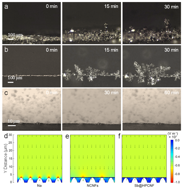 图5 原位可视化观测不同基底表面的Na沉积过程,a)纯Na片,b)NCNFs及c)Sb@HPCNF基底;多物理场模拟不同基底表面的电场分布情况,d)纯Na片,e)NCNFs及f)Sb@HPCNF基底
