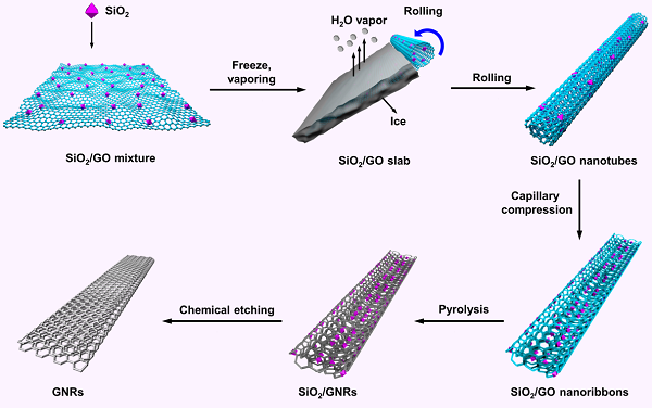 我校化学与化工学院多相催化团队提出了一种“冷冻-卷曲-压缩”的策略,通过将大片层(平均宽度~20微米)的氧化石墨烯与二氧化硅溶胶超声混合,并在低温低压下进行脱水干燥和化学刻蚀,制备出了高纯度、高径向比的石墨烯纳米带材料(图1)。这种策略采用自上而下的方式,以单层的氧化石墨烯为原料,通过改变其拓扑结构,实现了高纯度石墨烯纳米带的宏量制备。该策略比小分子合成、径向剪切碳纳米管等方法更直接、更简洁,得到的石墨烯纳米带的纯度也更高。