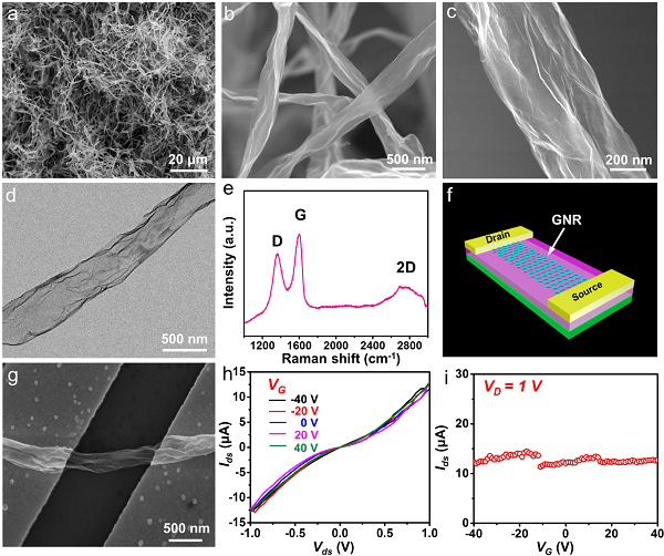 图2 石墨烯纳米带宏量制备、结构表征与性能测试