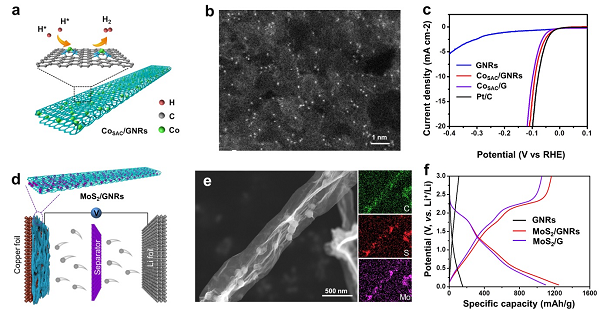 此外,通过在层间进行客体分子/纳米材料修饰,可以实现对石墨烯纳米带材料的功能化设计,从而显著拓展石墨烯纳米带的应用范围。研究人员借助“冷冻-卷曲-压缩”的策略,将杂原子前驱体(六福磷酸铵)、单原子前驱体(乙酰丙酮钴)与石墨烯/二氧化硅进行混合,或以球形二硫化钼(零维),聚苯胺纤维(一维)或二硫化硒纳米片(二维)代替二氧化硅,并经过高温处理或化学处理,分别可以得到了氮/磷/氟共掺杂的石墨烯纳米带、钴单原子修饰的石墨烯纳米带、层间修饰二硫化钼的石墨烯纳米带、层间负载聚苯胺的石墨烯纳米带以及层间修饰二硫化硒的石墨烯纳米带材料,实现了对石墨烯纳米带材料的功能化设计。如图3所示。