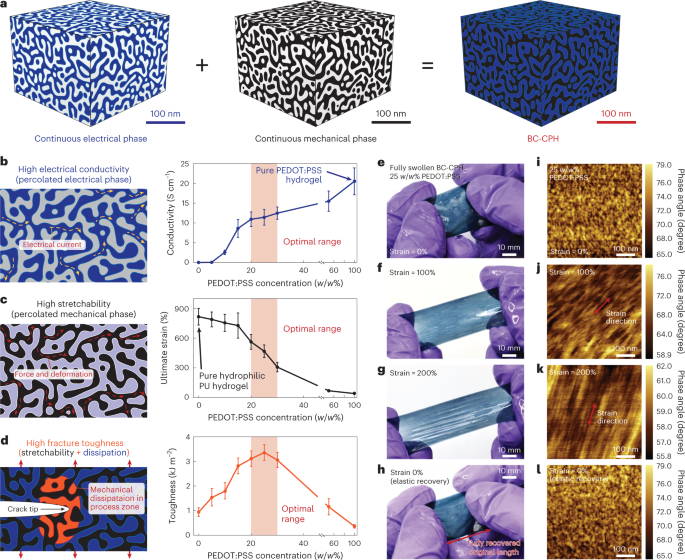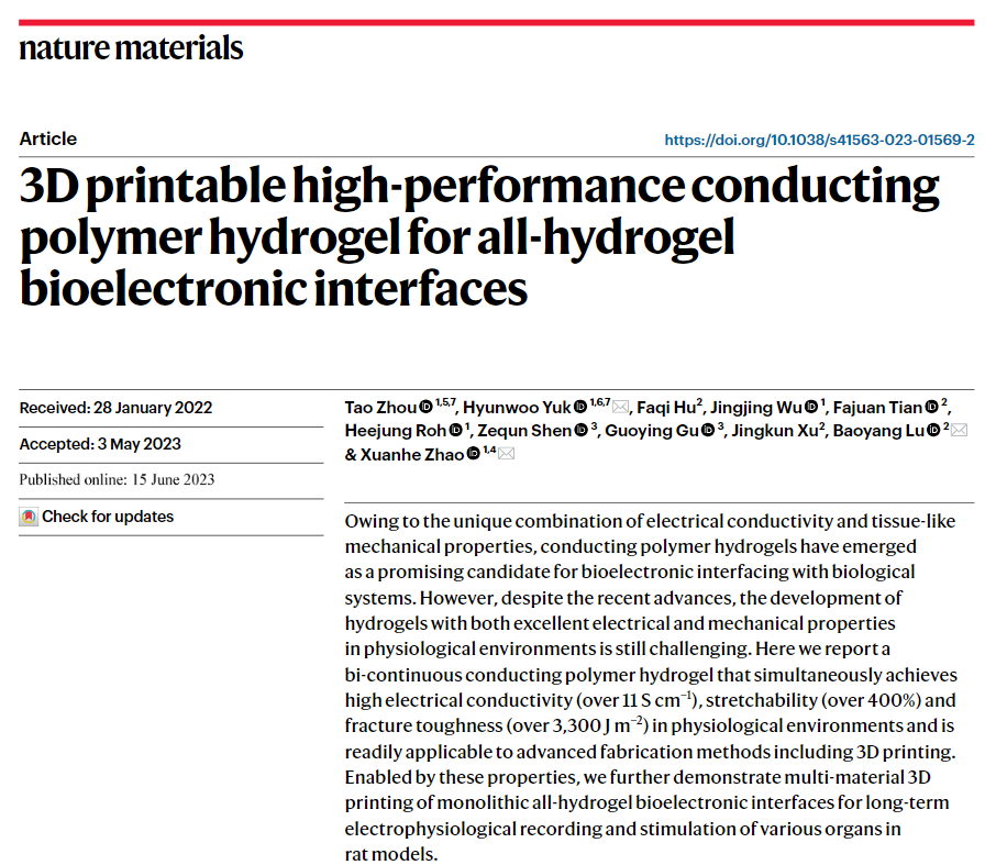 近日,麻省理工学院Xuanhe Zhao, Hyunwoo Yuk,江西HTH官网地址 师范大学Baoyang Lu等人报告了一种双连续导电聚合物水凝胶(BC-CPH)。BC-CPH同时实现高导电性、拉伸性和断裂韧性,适用于相关的研究成果以“3D printable high-performance conducting polymer hydrogel for all-hydrogel bioelectronic interfaces”为题发表在Nature Materials上。