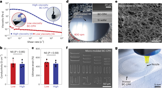 1、作者报告了一种双连续导电聚合物水凝胶,在不牺牲其机械性能的情况下克服挑战实现高导电性。BC-CPH可以很容易地从由电相和机械相组成的相分离油墨中制备,并允许使用各种先进的制造策略,包括旋转涂层和静电纺丝(低粘度油墨)以及微成型和3D打印(高粘度油墨)